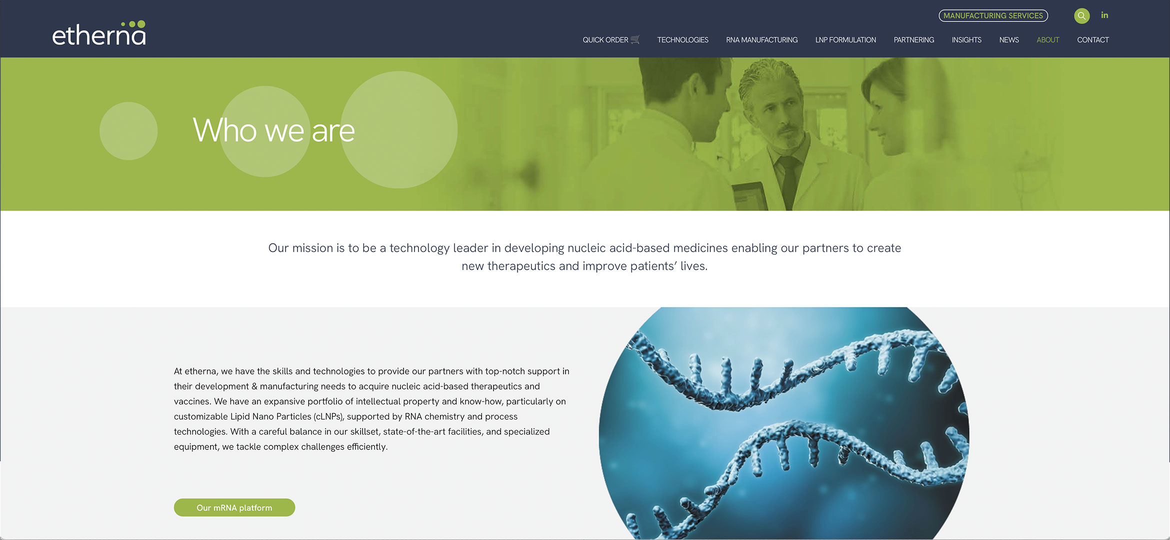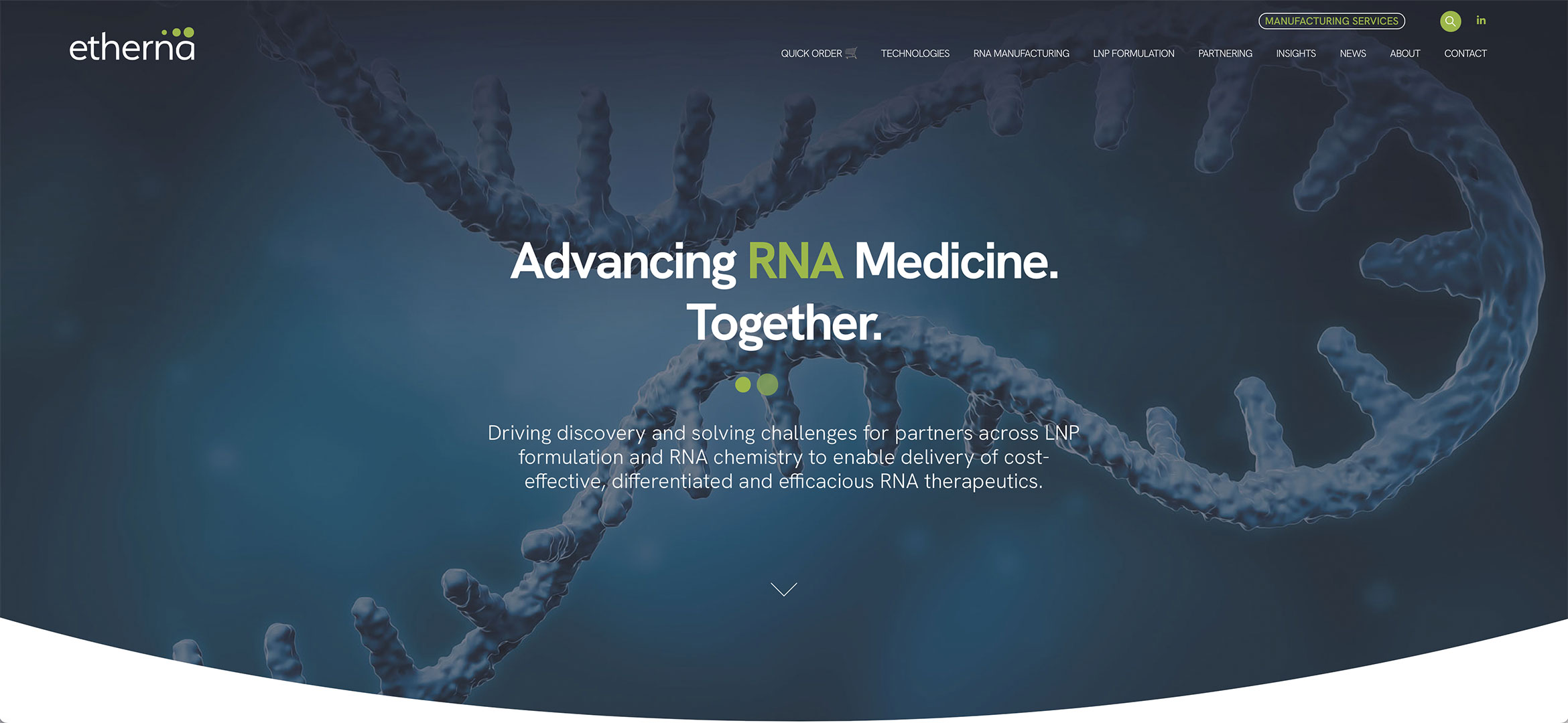 After rebranding Belgium based Etherna, we were asked to rewrite and design their 2 websites – one for their corporate communications and the other promoting their manufacturing capabilities. Each had to relate but be distinguished by colours. As an eye catching design feature we animated the logo icon element to make the site behave and look more dynamic.
