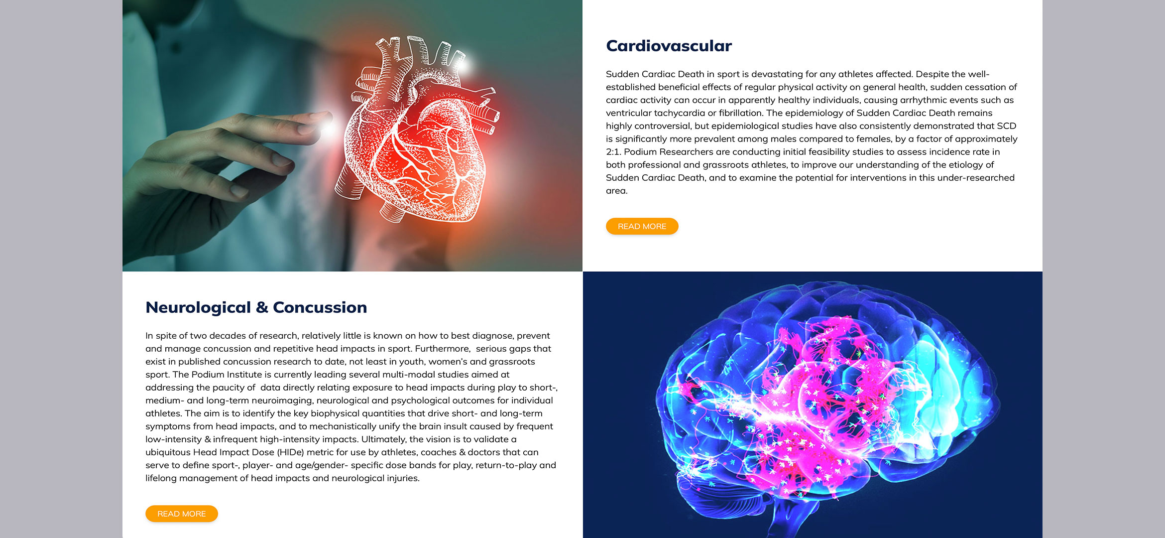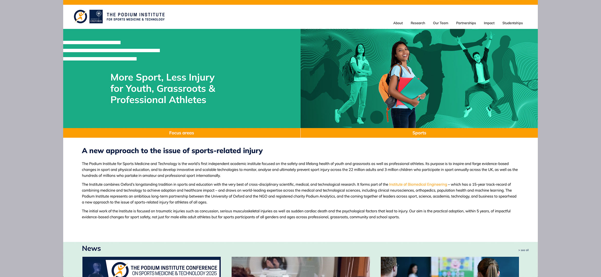 Working with the IBME at the University of Oxford, Conscience were asked to design and produce a website for the ‘Podium Institute for Sports Medicine and Technology’ – the world’s first independent academic institute focused on the safety and lifelong health of youth and grassroots as well as professional athletes. The website wanted to be colourful, engaging and help inspire and forge evidence-based changes in sport and physical education, develop innovative and scalable technologies to monitor, analyse and ultimately prevent sport injury across the 22 million adults and 3 million children who participate in sport annually across the UK, as well as the hundreds of millions who partake in amateur and professional sport internationally.